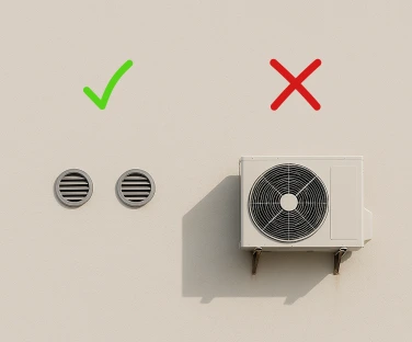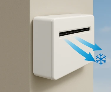 Cooling and heating are achieved through air exchange with the outside via two ventilation openings with a diameter of 180 mm. This allows the unit to provide efficient cooling and heating without the need to open windows or install a refrigerant line system.